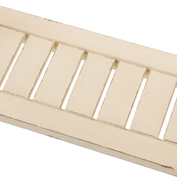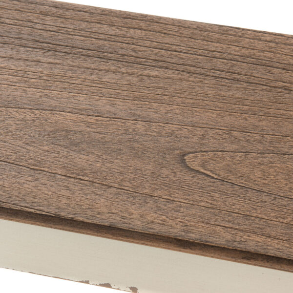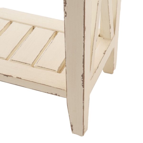 Consola de entrada en madera decorada en blanco roto envejecido con efecto desgastado vintage y tapa texturizada color nogal con bandeja de listones y laterales con aspas decorativas.