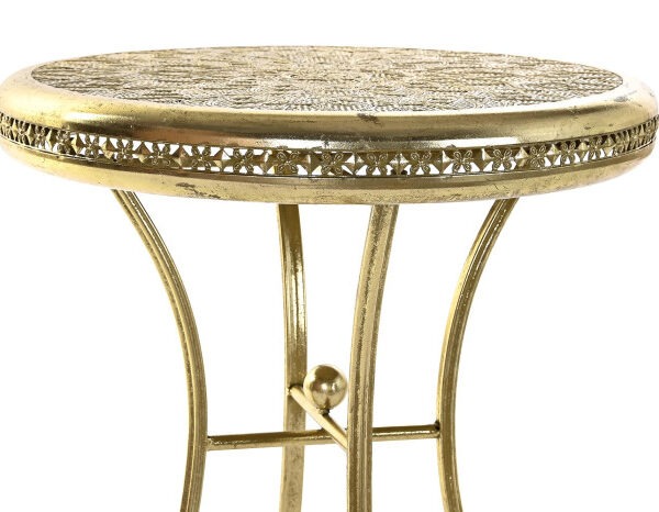 Mesita auxiliar metal dorado con diseño en estilo oriental. En medida de 42x42x58 cm. Ideal para combinar en el salón entre sofás o como mesita velador. Por su altura se podría usar como mesilla de noche para un dormitorio. En ambientes de estilo étnico o vintage.