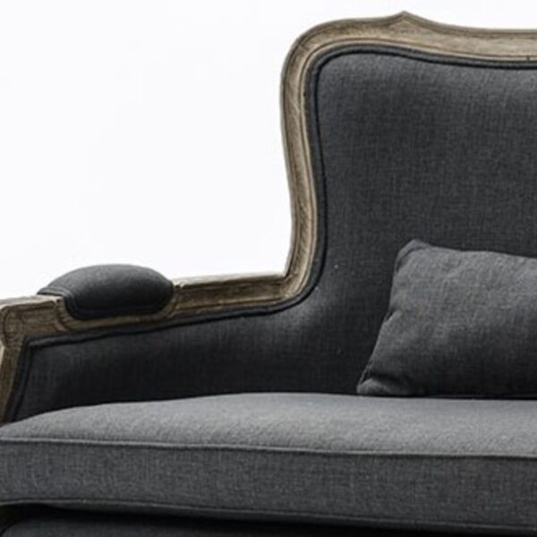 Sofá doble Clásico tapizado en color gris y estructura de madera de caoba acabado mate estilo envejecido con ligera patina blanca. Los 2 cojines riñoneros están incluidos. Ideal para ambientes de estilo romántico, clásico o vintage. En medida de 150x92x81cm.